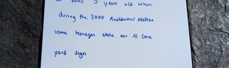 I was 5 years old when during the 2004 Presidential election some teenagers stole our Al Gore yard sign.