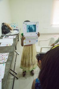 A final challenge we grappled with was recognition. Yes, we were doing research and that meant guaranteeing anonymity as much as possible but within the conventions of exhibiting, we also wanted to practice some form of recognition of the children as creators of the photo/stories. The photo/stories were their work, not ours. Here we came up with the idea of ‘anonymous portraits’ of the children as a way of acknowledging their authorship of the photo/stories without compromising their identities. The idea came from both artistic and activist practices past and present. There is a long tradition in both of concealing one’s legal identity in order to safely make private troubles public when it was unlikely that a novel by a woman author would be published or the raising of a contentious issue would endanger someone’s life. During the children’s workshops, we worked together to take anonymous portraits. We asked children to strike a pose that said something about them without revealing their faces. The children took photos of each other with a polaroid camera, a professional photographer worked with the children to take the same portrait with a DSLR for better image quality*.