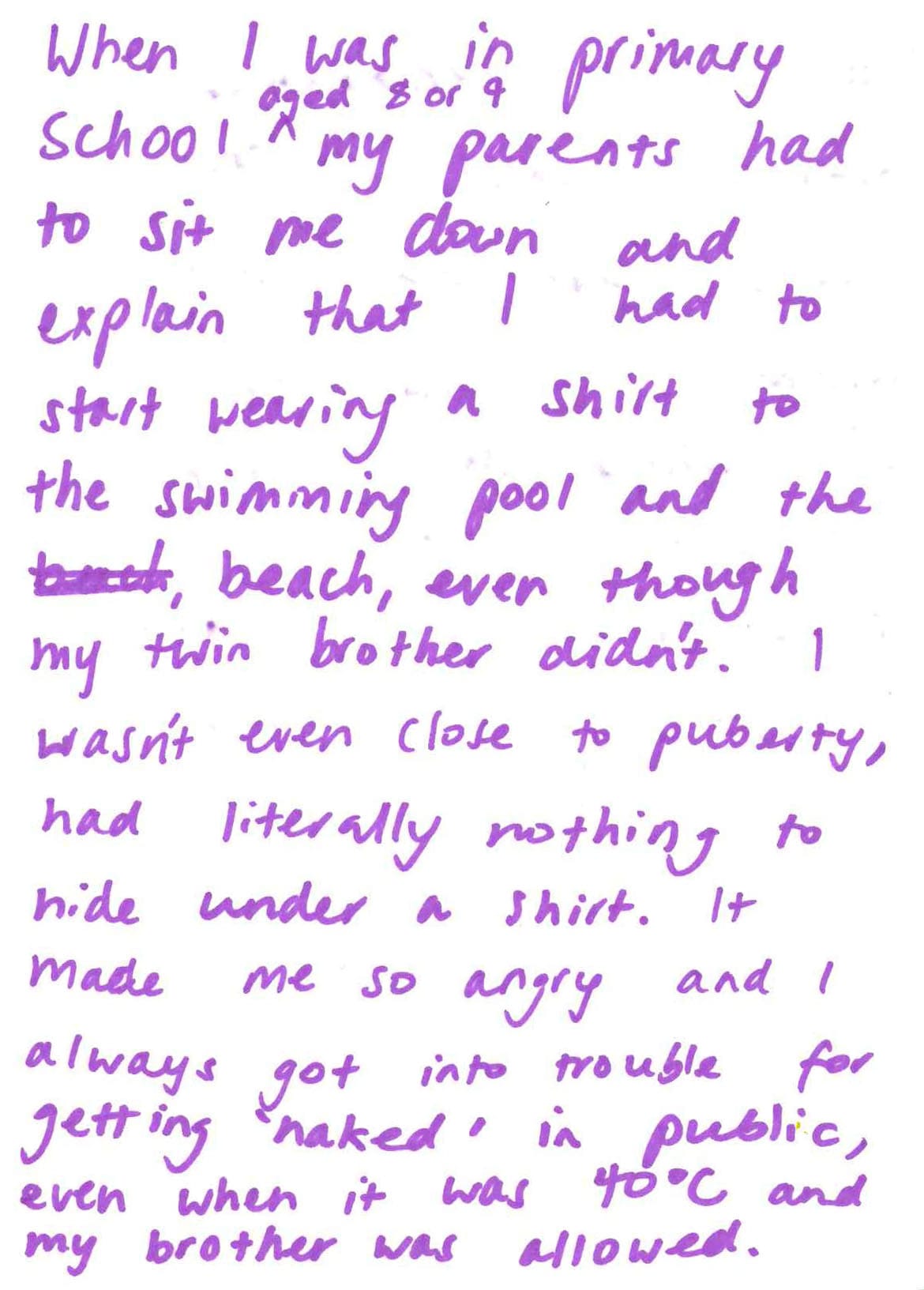 When I was in primary school aged 8 or 9 my parents had to sit me down and explain that I had to start wearing a shift to the swimming pool and the beach, even though my twin brother didn’t. I wasn’t even close to puberty, had literally nothing to hide under a shirt, It made me so angry and I always got into trouble for getting ‘naked’ in public, even when it was 40°C and my brother was allowed.