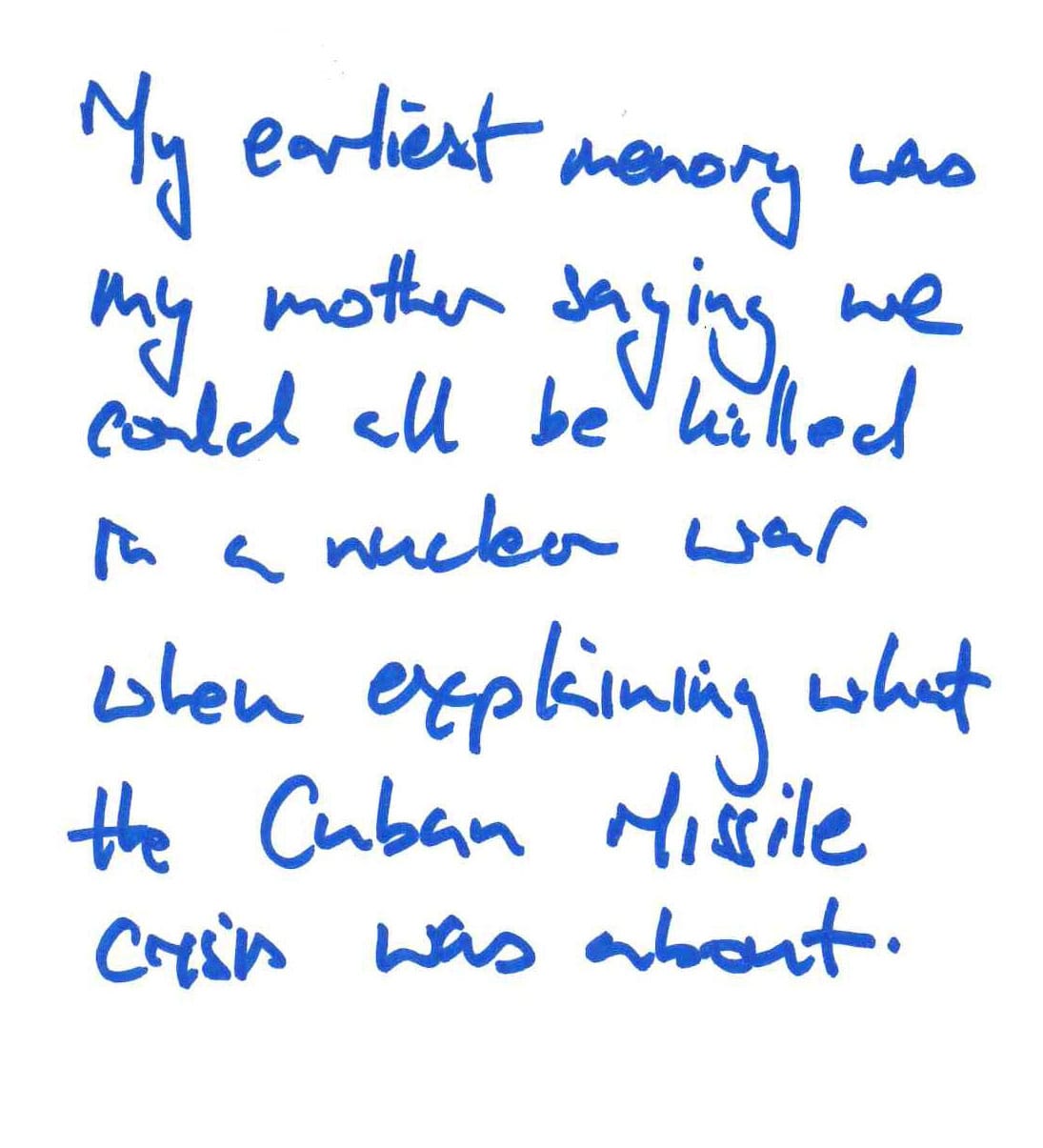 My earliest memory was my mother saying we could all be killed in a nuclear war when explaining what the Cuban Missile Crisis was about.
