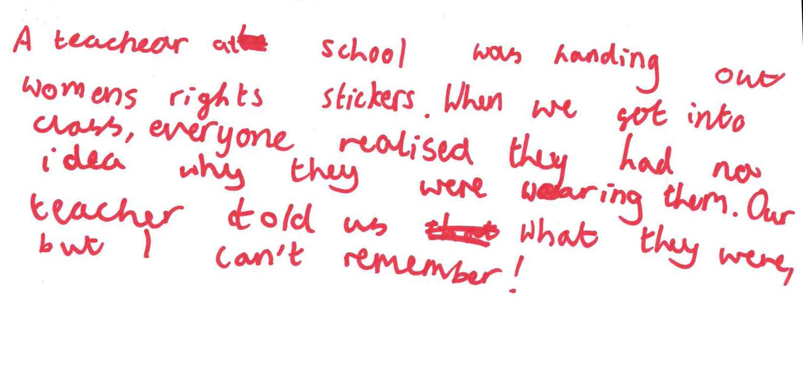 A teacher at school was handing out womens rights stickers. When we got into class, everyone realised they had no idea why they were wearing them. Our teacher told us what they were, but I can’t remember!