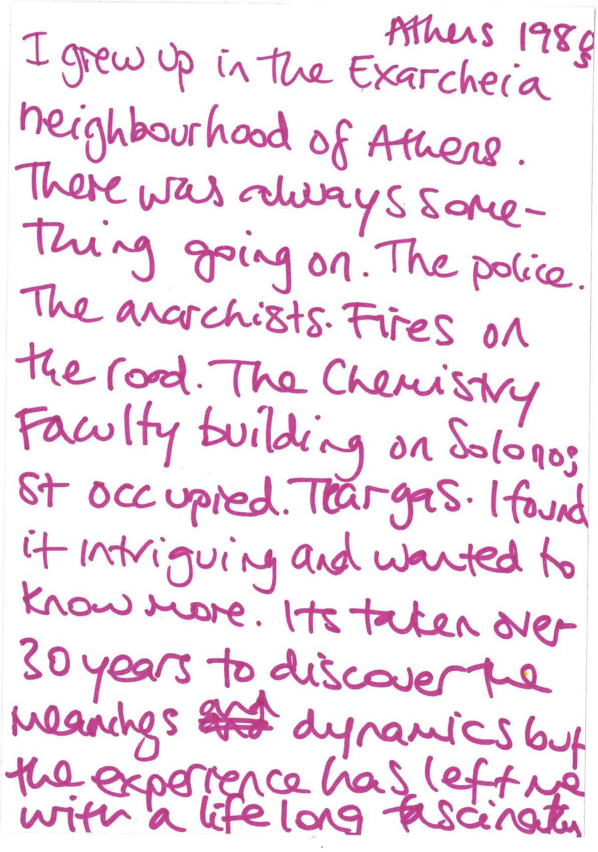 I grew up in the Exarcheia neighbourhood of Athens. There was always something going on. The police. The anarchists, Fires on the road, The Chemistry Faculty building on Solonos St occupied. Tear gas. I found it intriguing and wanted to know more. Its taken over 30 years to discover the meanings and dynamics but the experience has left me with a lifelong fascination with politics and culture.