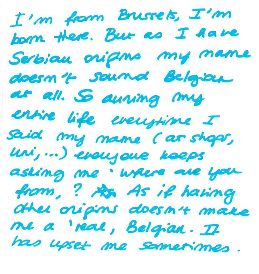 I’m from Brussels, I’m born there. But as I have Serbian origins my name doesn’t sound Belgian at all. So during my entire life everytime I said my name (at shops, uni,…) everyone keeps asking me “where are you from?” As if having other origins doesn’t make me a ‘real’ Belgian. It has upset me sometimes.