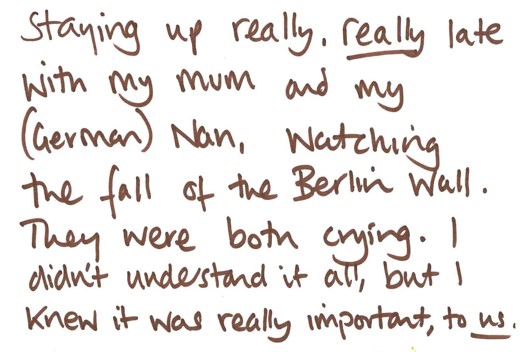 Staying up really, really late with my mum and my (German) Nan, watching the fall of the Berlin Wall. They were both crying. I didn’t understand it all, but I knew it was really important, to us.
