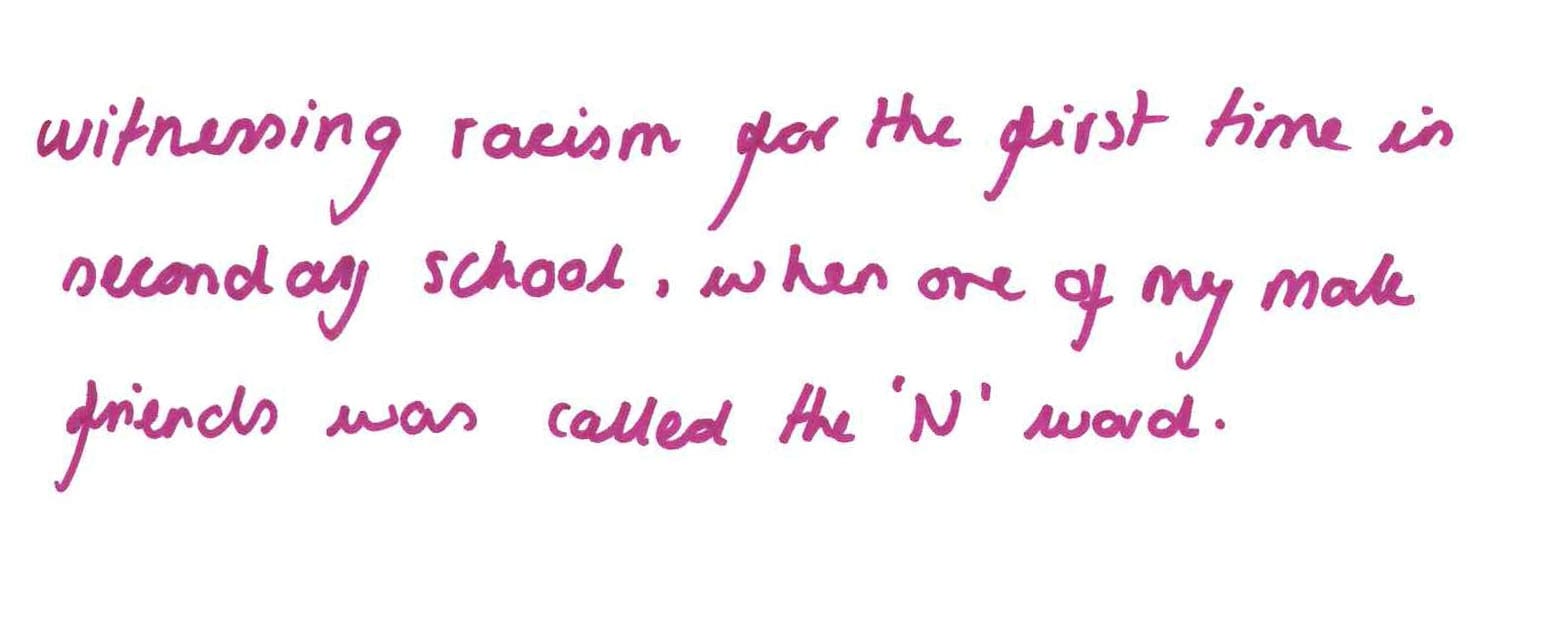witnessing racism for the first time in secondary school, when one of my male friends was called the ‘N’ word.