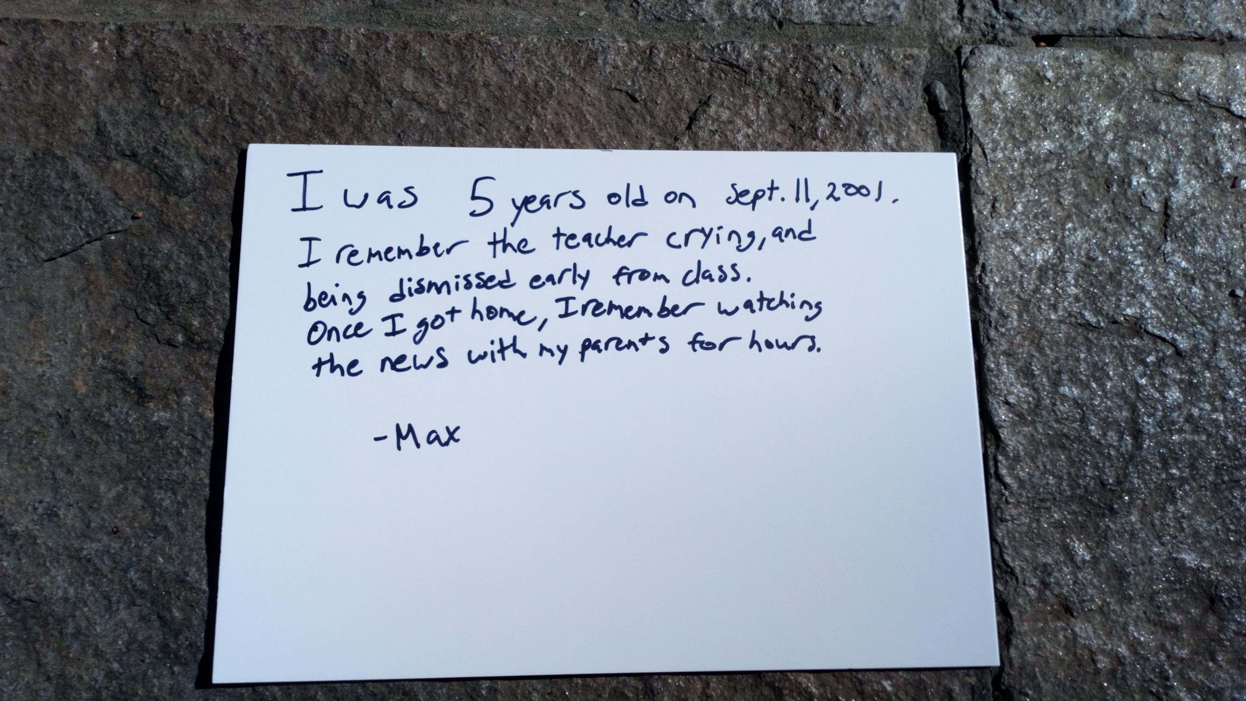 I was 5 years old on Sep. 11, 2001. I remember the teacher crying, and being dismissed early from class. Once I got home, I remember watching the news with my parents for hours.