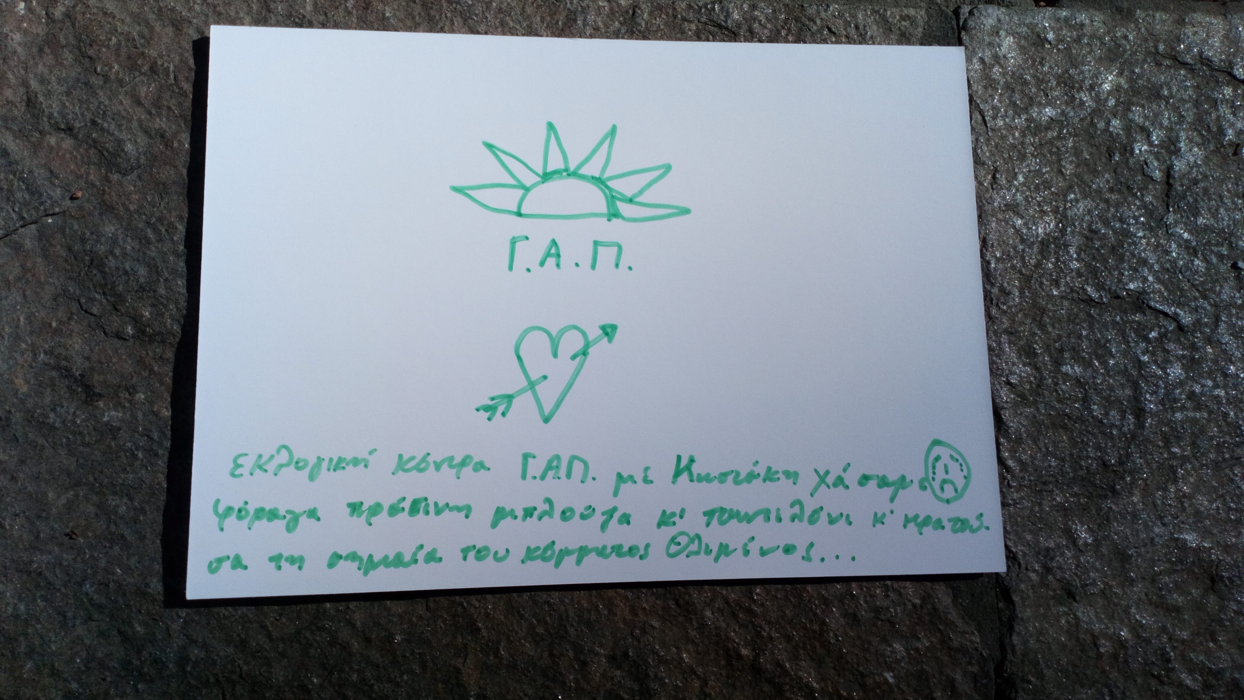 [1] G.A.P.: nickname of George A. Papandreou, former head of the Panhellenic Socialist Movement (PASOK) and former Prime Minister of Greece. “Kostakis”: nickname of Kostas Karamanlis, former head of the right-wing party Nea Dimokratia and former Prime Minister of Greece. The person is referring to green a lot, since green is the colour of PASOK.