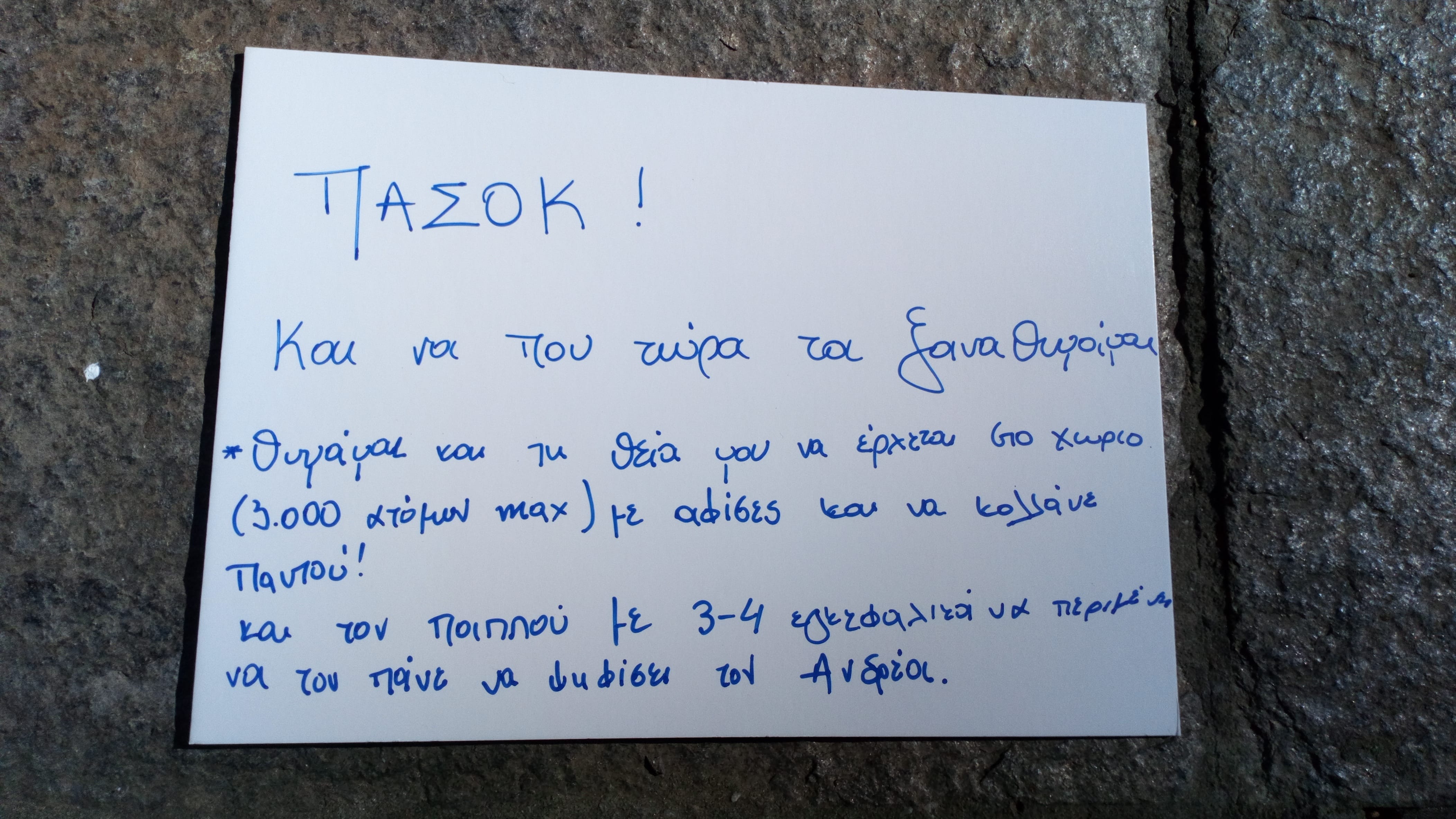 ΠΑΣΟΚ! Και να που τώρα τα ξαναθυμάμαι. Θυμάμαι και τη θεία μου να έρχεται στο χωριό (3.000 ατόμων max.) με αφίσες και να κολλάνε παντού! Και τον παππού με 3-4 εγκεφαλικά να περιμένει να τον πάνε να ψηφίσει τον Αντρέα.