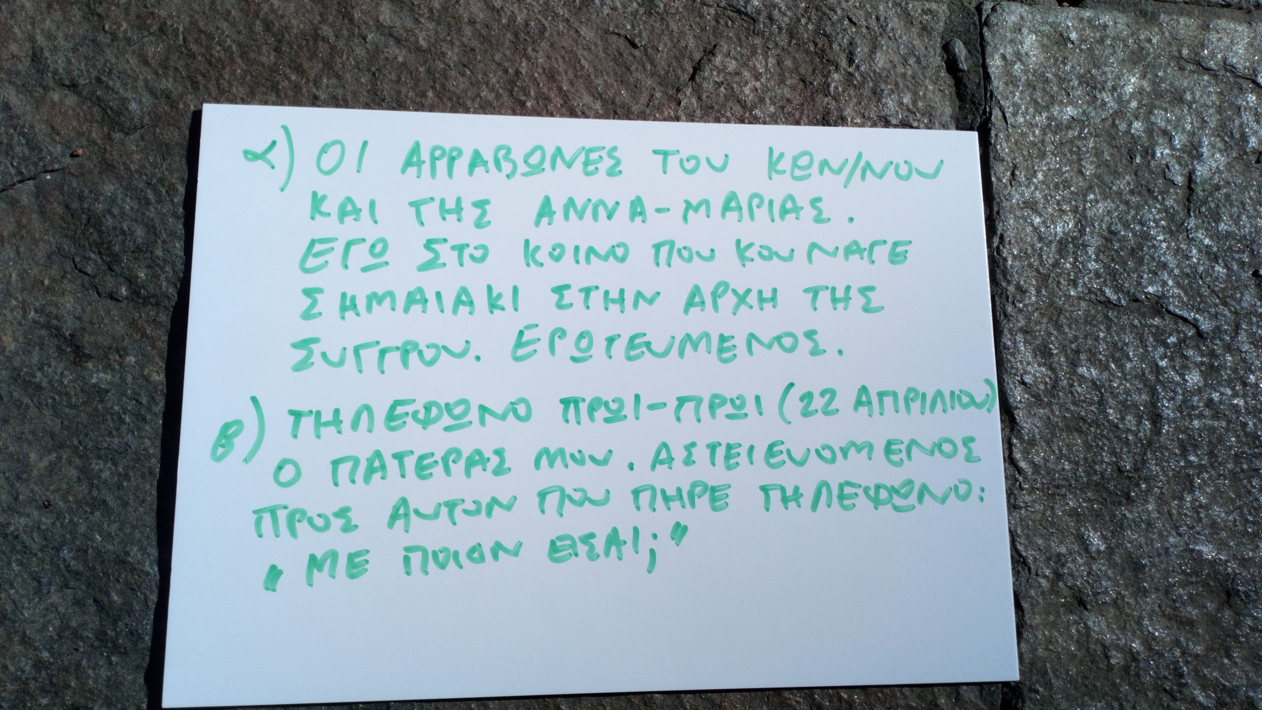 α) Οι αρραβώνες του Κων/νου και της Άννα-Μαρίας. Εγώ στο κοινό που κούναγε σημαιάκι στην αρχή της Συγγρού. Ερωτευμένος. β) Τηλέφωνο πρωί πρωί (22 Απριλίου). Ο πατέρας μου, αστειευόμενος, προς αυτόν που πήρε τηλέφωνο: «με ποιον είσαι;»