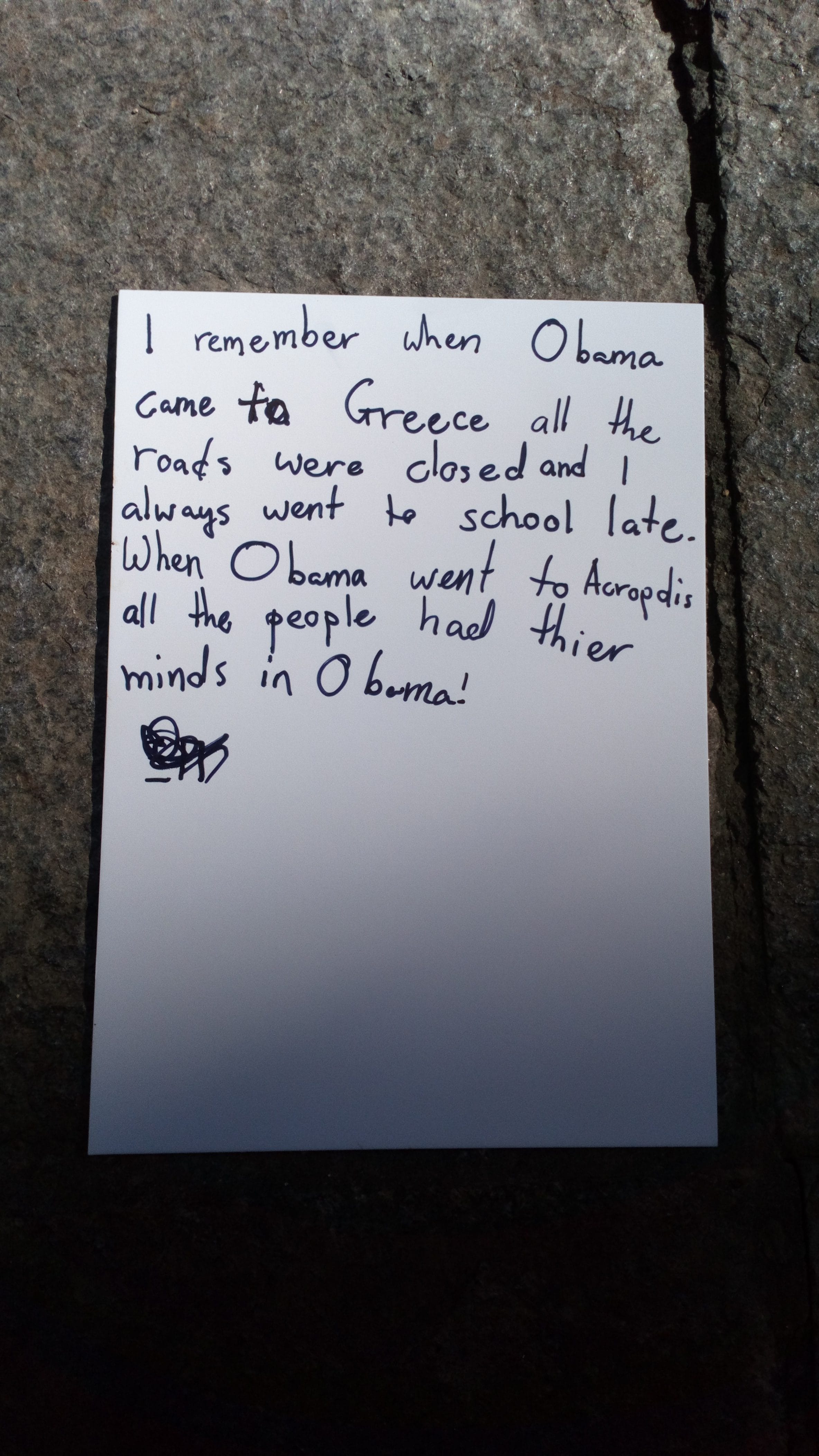 I remember when Obama came to Greece all the roads were closed and I went to school late. When Obama went to the Acropolis, all the people had their minds on Obama!