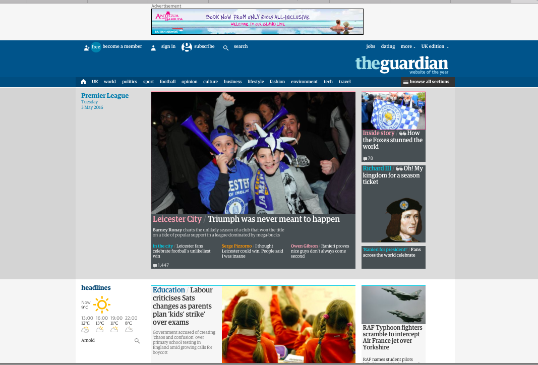 However, if, online newspapers ‘most popular reads’ listings can be a crude form of contextualisation and of taking the pulse of a readership then, this morning the school boycott item does not appear to vex the readership of the above papers as much as commentators suggest. It’s not on the top 10 of either the Guardian (the top item is Leicester city), or the Telegraph (this is a top 5 list, the top item is Monday evening’s episode of Game of Thrones) or the Daily Mail (the top item is about health and safety on an Alton Towers ride, but the item about school sanctions for parents taking children out of school is number 10). The news of the strike appears as number 9 on the BBC News website (top item is about RAF jets and sonic booms), when I last check at 10am this morning, up one item from number 10 an hour earlier.