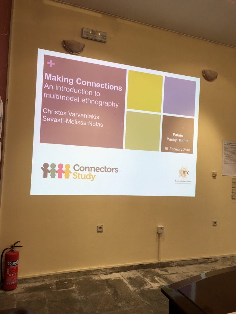 As we sat chatting over dinner during the European Sociological Association conference in August 2017 in Athens, the idea emerged to run what we later called the ‘making connections’ workshops. We thought of these workshops as a series of events focusing on methodological and analytical issues relating to multimodal ethnography, based on a pedagogy of experiential learning and aiming to create relational, open spaces. We had hoped that these workshops would genuinely provide insights into the messiness of the actual research practice, and could thus enable the sharing of experiences and the creation of a community of practice.