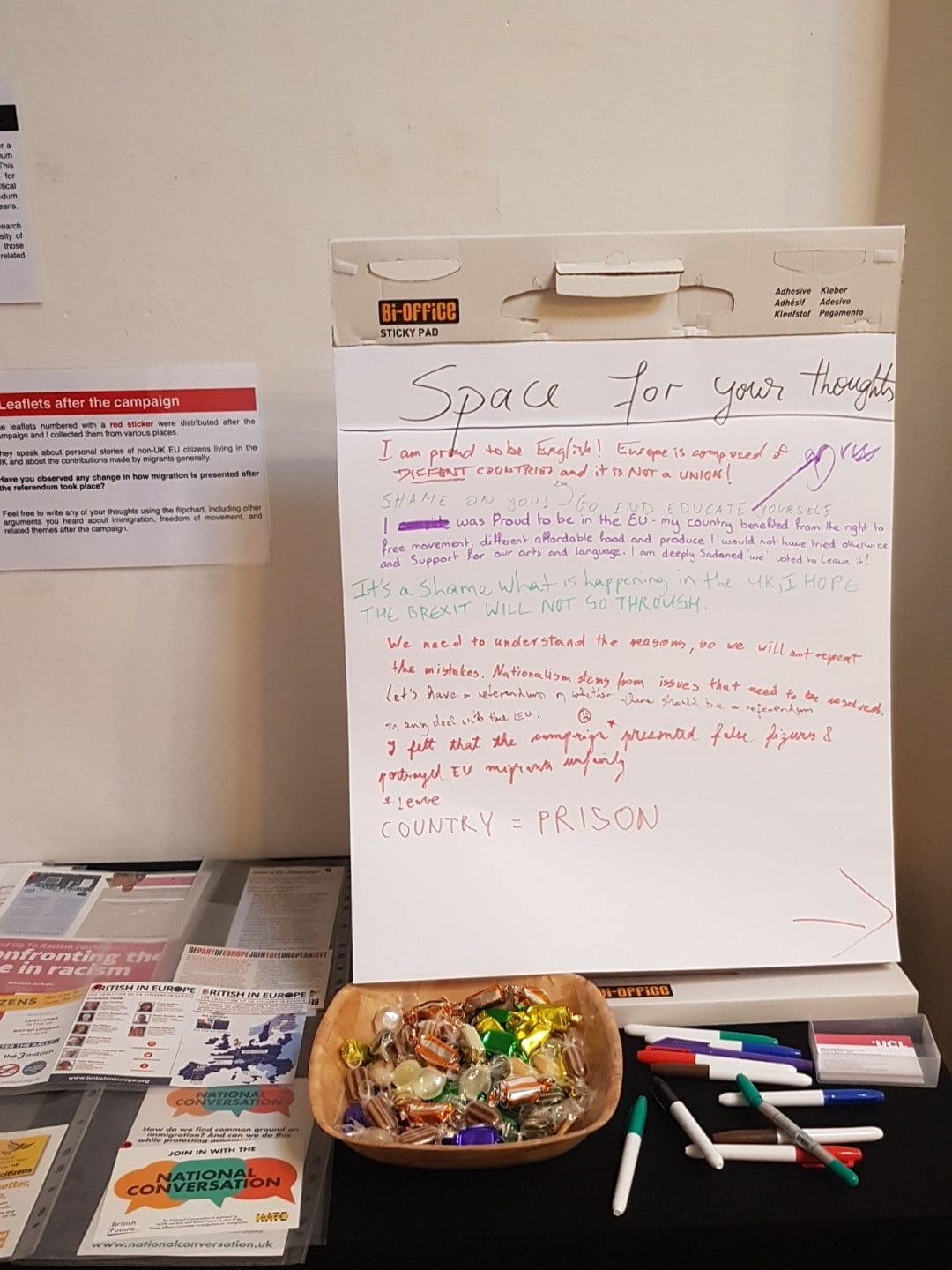 One such method was including a ‘space for your thoughts’ flipchart during a mini-exhibition I had at the Bloomsbury Festival in 2017. People could look at a sample of leaflets which all spoke about immigration, published before and after the referendum campaign. The flipchart provided a space for them to express their thoughts on the referendum itself, or more specifically on how migration was represented during the campaign.