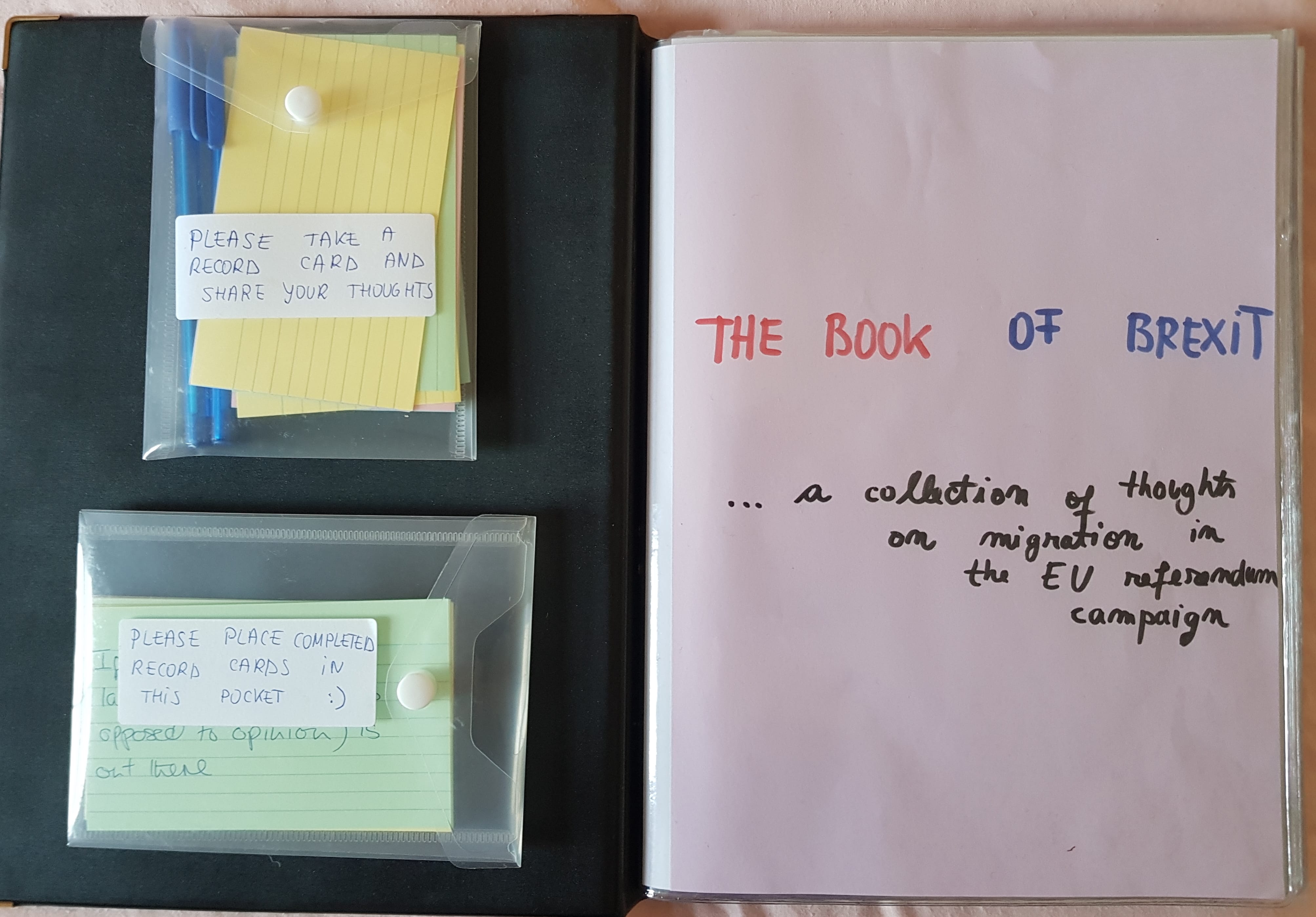 To keep all those materials in an organised way, I created ‘The Book of Brexit’. Inspired by the ‘In Limbo’ book, a collection of testimonies from non-UK EU citizens in the context of Brexit, I aim to collect first impression or thoughts people have about the immigration debates. The contributors will not only be the interview participants, but anyone who finds the book in the different places I travel to. The colorful record cards on which thoughts are written will include a diversity of voices, some not heard at all during the official debates, to form a collective image of attitudes to immigration in the context of Brexit.